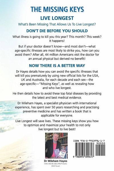 LIVE LONGEST DON'T DIE BEFORE YOU SHOULD What illness is going to kill you this year? This month? This week? It happens! But if your doctor doesn't know-and most don't-what age-specific illnesses are most likely to strike you, how can you avoid them? After all, 44 million Americans visit the doctor for an annual physical but derived no benefit! NOW THERE IS A BETTER WAY Dr Hayes details how you can avoid the specific illnesses that will kill you prematurely by using new official lists for the USA, UK and Australia, for each decade and each sex-the age-specific-"Missing Keys", as well as revealing how and who live longest. He then details how to avoid these top fatal diseases by providing the latest and best medical evidence. Dr Mileham Hayes, a specialist physician with international experience, has spent over 50 years researching and practising preventive medicine and has written a book that is applicable for everyone. Live Longest will save lives. These missing keys show you how to optimize and maximize your health to not only live longest but to live best! Featuring Fast Start Essentials for: • Newtrition© - the world's healthiest foods • Successful ageing • Exercise • Optimum weight