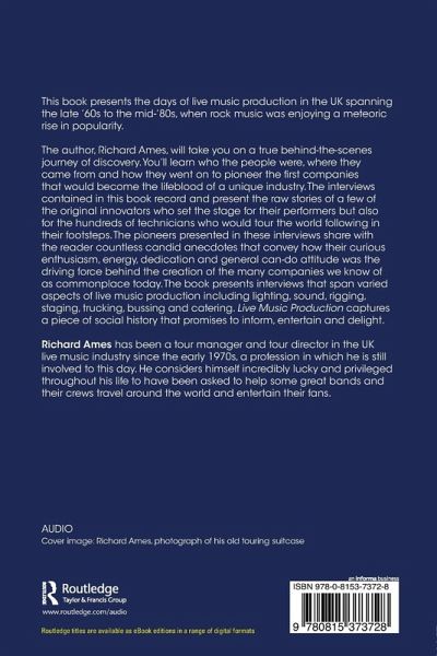 This book presents the days of live music production in the UK spanning the late '60s to the mid-'80s, when rock music was enjoying a meteoric rise in popularity. The author, Richard Ames, will take you on a true behind-the-scenes journey of discovery. You'll learn who the people were, where they came from and how they went on to pioneer the first companies that would become the lifeblood of a unique industry. The interviews contained in this book record and present the raw stories of a few of the original innovators who set the stage for their performers but also for the hundreds of technicians who would tour the world following in their footsteps. The pioneers presented in these interviews share with the reader countless candid anecdotes that convey how their curious enthusiasm, energy, dedication, and general can-do attitude was the driving force behind the creation of the many companies we know of as common place today. The book presents interviews that span varied aspects of live music production including lighting, sound, rigging, staging, trucking, bussing and catering. Live Music Production captures a piece of social history that promises to inform, entertain and delight.