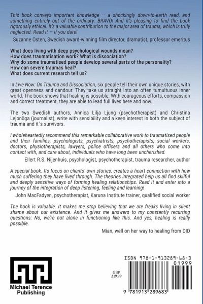 This book conveys important knowledge - a shockingly down-to-earth read, and something entirely out of the ordinary. BRAVO! And it's pleasing to find the book rigorously ethical. It's a valuable contribution to the major area of trauma, which is truly neglected. Read it - if you dare! - Suzanne Osten, Swedish award-winning film director, dramatist, professor emeritus What does living with deep psychological wounds mean? How does traumatisation work? What is dissociation? Why do some traumatised people develop several parts of the personality? How can severe traumas heal? What does current research tell us? In Live Now: On Trauma and Dissociation, six people tell their own unique stories, with great openness and candour. They take us straight into an often tumultuous inner world. The book shows that healing is possible. With courageous efforts, compassion and correct treatment, they are able to lead full lives here and now. The two Swedish authors, Annica Lilja Ljung (psychotherapist) and Christina Lejonöga (journalist), write with sensibility and a keen interest in both the subject of trauma and it¿s survivors. I wholeheartedly recommend this remarkable collaborative work to traumatised people and their families, psychologists, psychiatrists, psychotherapists, social workers, doctors, physiotherapists, lawyers, police officers and all others who come into contact with, and care about, individuals who have long been uncherished. - Ellert R.S. Nijenhuis, psychologist, psychotherapist, trauma researcher, author A special book. Its focus on clients' own stories, creates a heart connection with how much suffering they have lived through. The theories integrated help us all find skilful and deeply sensitive ways of forming healing relationships. Read it and enter into a journey of the integration of deep listening, feeling and learning!- John MacFadyen, psychotherapist, Karuna Institute trainer, qualified social worker The book is valuable. It makes me stop believing that we are freaks living in silent shame about our existence. And it gives me answers to my constantly recurring questions: No, we're not alone in functioning like this. And yes, healing is really possible. - Mian, well on her way to healing from DID.