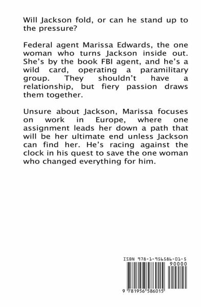 Will Jackson fold, or can he stand up to the pressure? Unsure what to do with his life after the military, Jackson finds his way out to his buddy's place. He's on edge but finds something special with federal agent Marissa Edwards. One night with her turns him inside out. Melissa needs his help, but can she trust him? They need each other, but Jackson have to break laws in the process to give her the help she needs. She's by the book FBI agent, and he's a wild card, operating a paramilitary group. They shouldn't have a relationship, but fiery passion draws them together. Will they be able to come together or will it all fall apart.