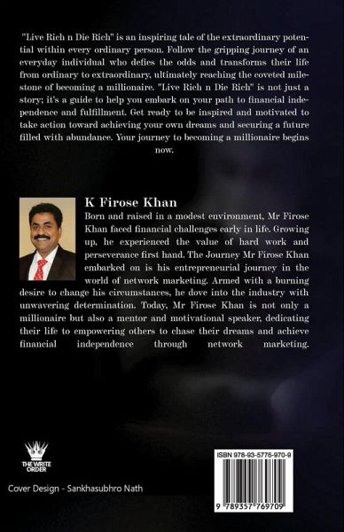 About the Book "Live Rich n Die Rich" is an inspiring tale of the extraordinary potential within every ordinary person. Follow the gripping journey of an everyday individual who defies the odds and transforms their life from ordinary to extraordinary, ultimately reaching the coveted milestone of becoming a millionaire. "Live Rich n Die Rich" is not just a story; it's a guide to help you embark on your path to financial independence and fulfillment. Get ready to be inspired and motivated to take action toward achieving your own dreams and securing a future filled with abundance. Your journey to becoming a millionaire begins now. About the Author K Firose khan Born and raised in a modest environment, Mr Firose Khan faced financial challenges early in life. Growing up, he experienced the value of hard work and perseverance first hand.The Journey Mr Firose Khan embarked on is his entrepreneurial journey in the world of network marketing. Armed with a burning desire to change his circumstances, he dove into the industry with unwavering determination. Today, Mr Firose Khan is not only a millionaire but also a mentor and motivational speaker, dedicating their life to empowering others to chase their dreams and achieve financial independence through network marketing.