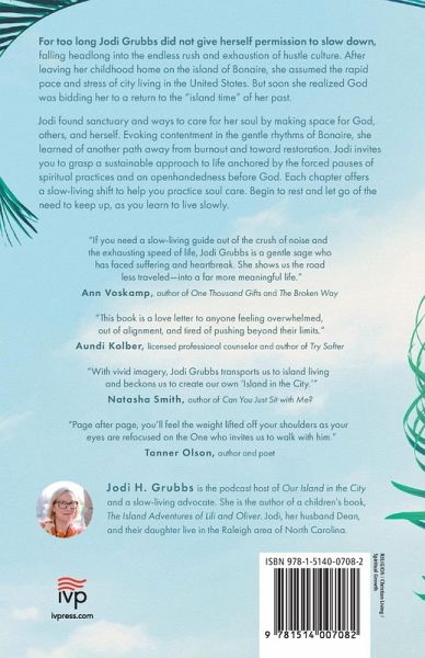 Give yourself permission to slow down. Jodi Grubbs did not give herself permission for too long, falling headlong into the endless rush and exhaustion of hustle culture. After leaving her childhood home on the island of Bonaire in the Caribbean, she had assumed the rapid pace and stress of city living in the States. Soon she realized God was bidding her to a return to the "island time" of her past. In time Jodi found sanctuary and ways to care for her soul by making space for God, others, and herself. Evoking the contentment she once had in the gentle rhythms of Bonaire, she learned of another path: a path away from burnout and toward restoration. And she invites you, too, to grasp a sustainable approach to life anchored by the forced pauses of spiritual practices and an openhandedness before God. Each chapter offers slow-living shifts to help you put the concepts into practice. Begin to rest and let go of the need to keep up, as you learn to live slowly.