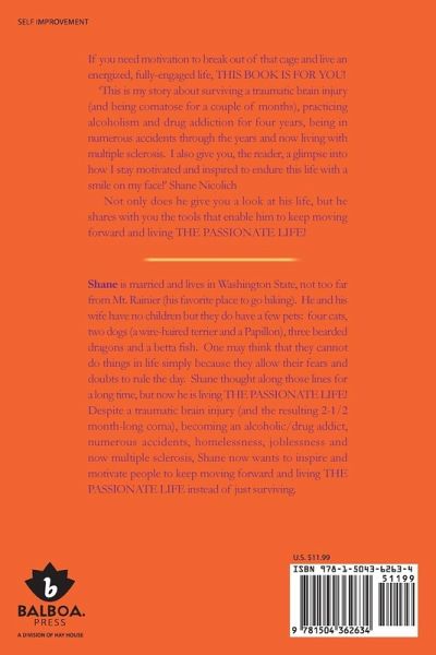If you need motivation to break out of that cage and live an energized, fully-engaged life, THIS BOOK IS FOR YOU! 'This is my story about surviving a traumatic brain injury (and being comatose for a couple of months), practicing alcoholism and drug addiction for four years, being in numerous accidents through the years and now living with multiple sclerosis. I also give you, the reader, a glimpse into how I stay motivated and inspired to endure this life with a smile on my face!' Shane Nicolich Not only does he give you a look at his life, but he shares with you the tools that enable him to keep moving forward and living THE PASSIONATE LIFE!