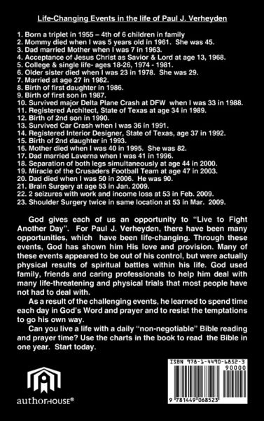 Do the decisions you make today affect your future? God gives most of us the chance to live to fight another day. What are you fighting for? Who are you fighting against? We all must realize that each day is really a battle, a spiritual battle against the forces of evil, darkness and ungodly behavior that fight for our attention and focus. See through this story and pictures how God can use events to win these battles, with the appropriate attitude and actions. Included in the back of this book are daily Bible Reading charts that enable you to read through the entire Old and New Testament in one year and help you also to win the battle for God, others and yourself.