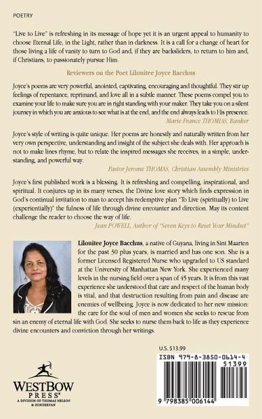"Live to Live" is refreshing in its message of hope yet it is an urgent appeal to humanity to choose Eternal Life, in the Light, rather than in darkness. It is a call for a change of heart for those living a life of vanity to turn to God and, if they are backsliders, to return to him and, if Christians, to passionately pursue Him. Reviewers on the Poet Lilouitee Joyce Bacchus Joyce's poems are very powerful, anointed, captivating, encouraging and thoughtful. They stir up feelings of repentance, reprimand, and love all in a subtle manner. These poems compel you to examine your life to make sure you are in right standing with your maker. They take you on a silent journey in which you are anxious to see what is at the end, and the end always leads to His presence. Marie France THOMIAS, Banker Joyce's style of writing is quite unique. Her poems are honestly and naturally written from her very own perspective, understanding and insight of the subject she deals with. Her approach is not to make lines rhyme, but to relate the inspired messages she receives, in a simple, understanding, and powerful way. Pastor Jerome THOMAS, Christian Assembly Ministries Joyce's first published work is a blessing. It is refreshing and compelling, inspirational, and spiritual. It conjures up in its many verses, the Divine love story which finds expression in God's continual invitation to man to accept his redemptive plan "To Live (spiritually) to Live (experientially)" the fulness of life through divine encounter and direction. May its content challenge the reader to choose the way of life. Jean POWELL, Author of "Seven Keys to Reset Your Mindset"
