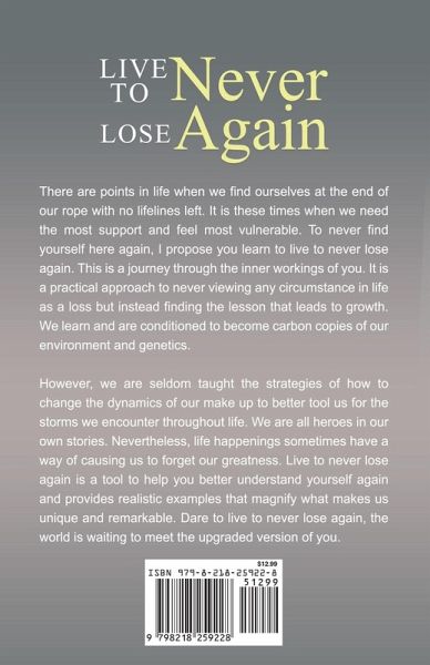 There are points in life when we find ourselves at the end of our rope with no lifelines left. It is these times when we feel most vulnerable and need the most support. To never find yourself here again, I propose you learn to live to never lose again. This is a journey through the inner workings of you. It is a practical approach to never viewing any circumstance in life as a loss, but instead finding the lesson that leads to growth. We learn and are conditioned to become carbon copies of our environment and genetics. However, we are seldom taught the strategies of how to change the dynamics of our make-up to better tool us for the storms we encounter throughout life. We are all heroes in our own stories. However, life happenings sometimes have a way of causing us to forget our greatness. Live to never lose again is a tool to help you better understand yourself again and provides realistic examples that magnify what makes us unique and remarkable. Dare to live to never lose again, the world is waiting to meet the upgraded version of you.