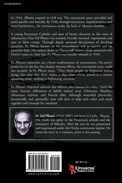 In 1944, Albania erupted in civil war. The communist party prevailed and acted quickly and brutally. By 1946, through executions, imprisonments, and mass banishments, the communists broke the back of Albania's freedom. A young Franciscan Catholic and man of heroic character in this time of inhumanity, Friar Zef Pllumi was arrested, brutally tortured, imprisoned, and sent to labor camps. Through deeply personal descriptions of shocking atrocities, Fr. Pllumi focuses on his extraordinary will to survive and his powerful faith. His intense desire to "live to tell" honors those martyred with Christ's name on their lips. Fr. Pllumi was initially released in 1949. Fr. Pllumi's memories are a brave confrontation of communism. His story's power lays in the fact that despite obscene efforts, the communist party could not succeed. As Fr. Pllumi states, "They think people are frightened before dying, but what they don't realize is that when you've arrived to a certain agonizing point, nothing is frightening anymore." Fr. Pllumi's historical memoir also delivers clear lessons for today. Amid the many horrors, differences in beliefs melted away. Christians, Muslims, Albanians, Italians, and French alike, although wounded physically, emotionally, and spiritually, were still alive to help each other and stand together and triumph for mankind.