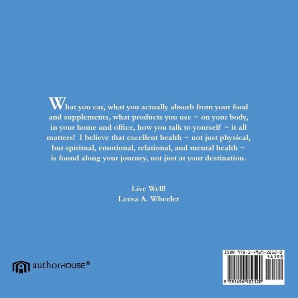 What you eat, what you actually absorb from your food and supplements, what products you use ~ on your body, in your home and office, how you talk to yourself ~ it all matters! I believe that excellent health ~ not just physical, but spiritual, emotional, relational, and mental health ~ is found along your journey, not just at your destination. Live Well! Leesa A. Wheeler
