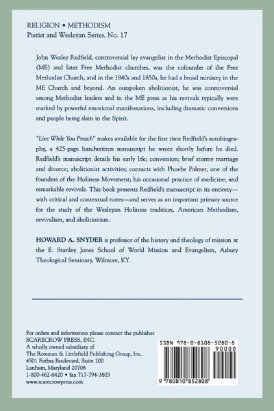 Dr. Snyder has done Methodist historians a great service with his meticulous editing of Redfield's entertaining, startlingly vivid autobiography. Methodist History American revivalist Redfield resisted the creeping respectability as Methodists began building large churches with stained glass and organs and tolerating dancing, card playing, novel reading, and jewelry. His recollections reveal a particular position within the debate that wracked the denomination during the 19th century. Published in collaboration with the Center for the Study of World Christian Revitalization Movements, Asbury Theological Seminary. Reference and Research Book News, August 2006