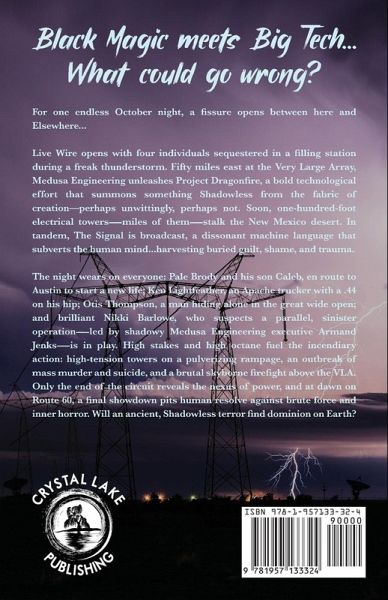 A storm is coming... In 1993 New Mexico, Black Magic and High Tech find common ground in Medusa Engineering's Project Dragonfire¿and for one endless October night, a fissure opens between here and Elsewhere... Live Wire, a horror thriller for science fiction fans, begins with four people sequestered in a desert filling station during a freak thunderstorm. Outside, one-hundred-foot electrical towers¿miles and miles of them¿uproot and stalk the desert. In tandem arrives The Signal, a dissonant machine language that subverts the human mind...harvesting old guilt, shame, and trauma. Fifty miles down the road at the Very Large Array, the Medusa Engineering Corporation unleashes Project Dragonfire, a bold technological effort that has summoned a ravenous entity from the very fabric of creation-perhaps unwittingly, perhaps not. Our ensemble includes Pale Brody and his son Caleb, en route to Austin to start a new life; Ken Lightfeather, an Apache trucker with a .44 on his hip; Kwik Gas proprietor Otis Thompson, who assumes the freak electrical storm has spawned the wandering giants; and fast-thinking Nikki Barlowe, who suspects a parallel, sinister operation¿led by shadowy Medusa Engineering executive Armand Jenks¿is in play. High stakes and high octane fuel the incendiary action¿mass murder and suicide, AC-130 Spectre gunships engaging the VLA in a brutal firefight, electrical towers pulverizing anything in their path, a massive gridwork of steel and feral energy blocking the only route of escape. Old ghosts and unresolved conflicts plague our characters as the signal interferes with their only task: surviving the onslaught. The night wears on everyone as the electrical towers converge on the Kwik Gas, and only the end of the circuit reveals the nexus of their power. At dawn on Route 60, a final showdown pits human resolve against brute force and inner horror. Will an ancient, shadowless terror find dominion on Earth? Live Wire is a tight, electrifying novel filled with action at a massive scale, terrors at the intimate level, and revelations of the Universal. If you like your fire hot, your blood red, and your metal mean, then this horror/science fiction hybrid is for you. Proudly represented by Crystal Lake Publishing-Tales from the Darkest Depths.