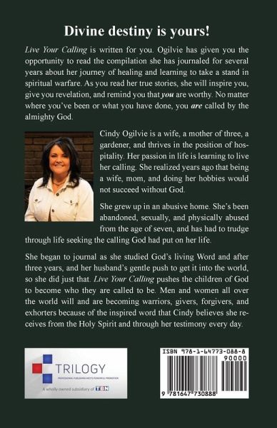 Divine destiny is yours! Live Your Calling is written for you. Ogilvie has given you the opportunity to read the compilation she has journaled for several years about her journey of healing and learning to take a stand in spiritual warfare. As you read her true stories, she will inspire you, give you revelation, and remind you that you are worthy. No matter where you've been or what you have done, you are called by the almighty God. Cindy Ogilvie is a wife, a mother of three, a gardener, and thrives in the position of hospitality. Her passion in life is learning to live her calling. She realized years ago that being a wife, mom, and doing her hobbies would not succeed without God. She grew up in an abusive home. She's been abandoned, sexually, and physically abused from the age of seven, and has had to trudge through life seeking the calling God had put on her life. She began to journal as she studied God's living Word and after three years, and her husband's gentle push to get it into the world, so she did just that. Live Your Calling pushes the children of God to become who they are called to be. Men and women all over the world will and are becoming warriors, givers, forgivers, and exhorters because of the inspired word that Cindy believes she receives from the Holy Spirit and through her testimony every day.