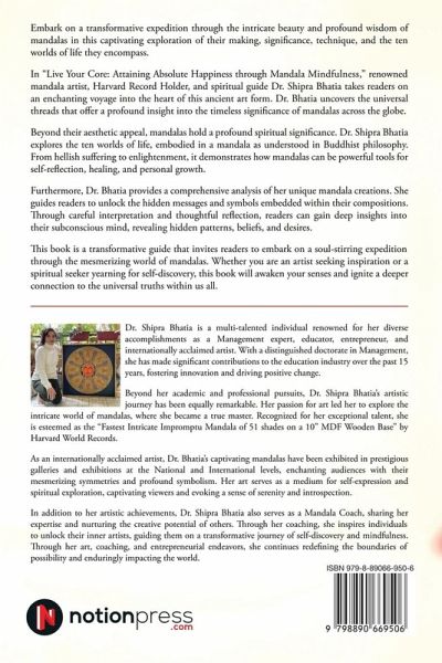 Embark on a transformative expedition through the intricate beauty and profound wisdom of mandalas in this captivating exploration of their making, significance, technique, and the ten worlds of life they encompass. In " Live Your Core: Attaining Absolute Happiness through Mandala Mindfulness," renowned mandala artist, Harvard Record Holder, and spiritual guide Dr. Shipra Bhatia takes readers on an enchanting voyage into the heart of this ancient art form. Dr. Bhatia uncovers the universal threads that offer a profound insight into the timeless significance of mandalas across the globe. Beyond their aesthetic appeal, mandalas hold a profound spiritual significance. Dr. Shipra Bhatia explores the ten worlds of life, embodied in a mandala as understood in Buddhist philosophy. From hellish suffering to enlightenment, it demonstrates how mandalas can be powerful tools for self-reflection, healing, and personal growth. Furthermore, Dr. Bhatia provides a comprehensive analysis of her unique mandala creations. She guides readers to unlock the hidden messages and symbols embedded within their compositions. Through careful interpretation and thoughtful reflection, readers can gain deep insights into their subconscious mind, revealing hidden patterns, beliefs, and desires. This book is a transformative guide that invites readers to embark on a soul-stirring expedition through the mesmerizing world of mandalas. Whether you are an artist seeking inspiration or a spiritual seeker yearning for self-discovery, this book will awaken your senses and ignite a deeper connection to the universal truths within us all.