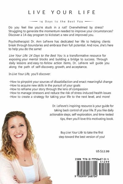Do you feel like you're stuck in a rut? Overwhelmed by stress? Struggling to generate the momentum needed to improve your circumstances? Discover a 14-day program to kickstart a new and improved you. Psychotherapist Dr. Ann LeFevre has dedicated her life to helping clients break through boundaries and embrace their full potential. And now, she's here to help you do the same! Live Your Life: 14 Days to the Best You is a transformative resource for exposing your mental blocks and building a bridge to success. Through daily lessons and easy-to-follow action items, Dr. LeFevre will guide you along the path of self-discovery, growth, and acceptance. In Live Your Life, you'll discover: -How to pinpoint your sources of dissatisfaction and enact meaningful change -How to acquire new skills in the pursuit of your goals -How to reframe your story through the lens of compassion -How to manage stressors and reduce the risk of stress-induced health issues -How to create a strategy for taking your life to the next level, and more! Dr. LeFevre's inspiring resource is your guide for taking back control of your life. If you like daily actionable steps, self-exploration, and time-tested tips, then you'll love this motivating book.