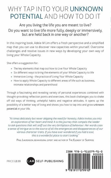 Why It's Time To Tap Into Your Unknown Potential And How To Do It Are you are living the life you are meant to live? Do you feel you could live life so much more deeply or immersively, but are held back in one way or another. In this inspiring book, Adele M Lim offers a fresh perspective and a simplified map that you can use to discover new capacities within yourself. Overcome challenges and resolve issues in new ways by developing your own way of living your Whole Capacity. She offers a suggestion for: The key elements that map out how to Live Your Whole Capacity Six different ways to bring the elements of your Whole Capacity to life Immersive Living - the practice of Living Your Whole Capacity How to apply Whole Capacity to different areas of life such as business, intimate relationships and parenthood Through a fascinating and revealing variety of personal experiences combined with thought-provoking reflection points and exercises, this book challenges you to shake off old ways of thinking, unhelpful habits and negative attitudes. It opens up the possibility of a better way of living and shows you how to how to tap into and grow unknown potential in your life.