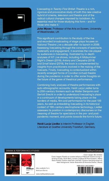This significant contribution to the study of the live and recorded broadcasting of stage plays focuses on National Theatre Live a decade after its launch in 2009. Assessing livecasting through the concepts of spectacle, materiality and engagement, it examines the role played by audiences in livecasting. Illustrated by in-depth analyses of recent NT Live shows, including A Midsummer Night's Dream (2019), Antony and Cleopatra (2018) and Small Island (2019), the book is complemented by insights from practitioners involved in the making of the livecasts. Finally, livecasting is contextualized within recently emerged forms of Covidian (virtual) theatre during the pandemic in order to offer some thoughts on the future of the genre of theatrical performance. Combining lively analyses of recent theatre performances with auto-ethnographic accounts, Heidi Lucja Liedke turns to 20th-century thinkers such as Walter Benjamin and Bertolt Brecht in order to understand livecasting's place in a continuum of developments taking place on the borders of media, film and performance for the past 100 years. As well as embedding livecasting in its historical context of 19th-century electrophone technology, Liedke assesses its position in contemporary discourses on the meaning of theatre for spectators in the pre- and post-pandemic moment, and points towards the form's future.