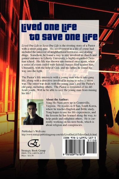 Lived One Life to Save One Life is the riveting story of a Pastor with a street gang past. His involvement in a life of crime had included the takeover of neighborhood territories and dealing drugs. Somehow, he found a way to stay involved in church and gained entrance to Liberty University, a highly-regarded Christian school. His life was thrown into turmoil once again, when a series of events ended with federal charges filed against him. Ultimately, with the help of God, and his father, he found his way into the light. The Pastor's life intersects with a young man who is into gang life, along with a detective involved in trying to solve a street war. The street war deals with the young man's and the Pastor's old gang, including others. The Pastor is reminded of his difficult youth. Will he be able to save the young man from ruining his life? About the Author: Yong Ho Nam grew up in Centreville, Virginia. He resides in Il San, South Korea, where he teaches English and Bible study. Yong hopes to use his life experiences, and the lessons he has learned along the way, to help guide and enlighten others. He is currently working on his next book, which is about religion and conspiracies. Publisher's Web site: http://www.strategicpublishinggroup.com/title/LivedOneLifeToSaveOneLife.html