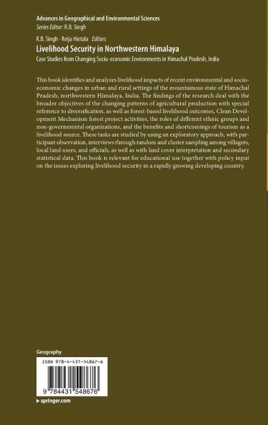 Introduction: Livelihood Security in Changing Socio-Economic Environment in Himachal Pradesh.- Geographic and Socio-Economic Realities of Himachal Pradesh, North western Himalaya.- Climate Change, Glacier Lakes and Livelihoods.- Land Use and Cover Change.- Human-Induced Biome and Livelihood Security.- Dynamics of Agricultural Production.- Shifting from Traditional Food Cropping to Cash Crop-ping.- Agriculture and Forestry Based Livelihood Capital Assessment.- The Challenges of Reforesting the Himalayas Through the Clean Development Mechanism: Perspectives from Rural Villages.- Participation in a CDM Afforestation/Reforestation Project in Himachal Pradesh: Success Stories and Shortcomings.- Ecosystem Services in Changing Environment.- On-Migration Aspirations and Livelihood Among Tibetan Newcomers.- Indian NGOs and Their Role of Networking.- Tourism and Solid Waste Management.- Rural Non-Farm and Tourism Based Livelihood Options.- Livelihood Space of an Indigenous Indian Tribe: Gaddi Community and its Livelihood Strategies.- Small Hydro Power Projects and Community Participation.- Livelihood Security in Changing Socio-Economic Environment: Summary and Policy Recommendations.