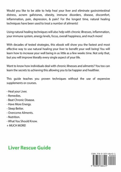 Would you like to be able to help heal your liver and eliminate gastrointestinal distress, acnem gallstones, obesity, immune disorders, disease, discomfort, inflammation, pain, depression, & pain? For the longest time, natural healing techniques have been used to treat a number of ailments! Using natural healing techniques will also help with chronic illnesses, inflammation, your immune system, energy levels, focus, overall happiness, and much more! Introducing the secrets natural healing professionals use to feel healthier than ever before and heal their ailments from an unhealthy liver! With decades of tested strategies, this ebook will show you the fastest and most effective way to use natural healing your liver to benefit your well being! You will learn how to increase your well being in as little as a few weeks time. Not only that, but you will improve literally every single aspect of your life. Want to know how individuals deal with chronic illnesses and ailments? You too can learn the secrets to achieving this allowing you to be happier and healthier. This guide teaches you proven techniques without the use of expensive supplements or courses. Whats Included: - Heal your Liver. - Remedies. - Beat Chronic Disease. - Have More Energy. - Sleep Better. - Overcome Ailments. - Nutrition. - What You Should Know. + MUCH MORE! If you want to be healthier, cure ailments, or improve focus & well-being then this guide is for you. Scroll to the top of the page and click add to cart to purchase instantly Disclaimer: This author and or rights owner(s) make no claims, promises, or guarantees in regards to the accuracy, completeness, or adequacy of the contents of this book, and expressly disclaims liability for errors and omissions in the contents within. This product is for reference use only. Please consult a professional before taking action on any of the contents found within.