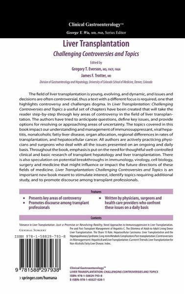 Liver Transplantation: Challenging Controversies and Topics grew out of a need I perceived within the fields of transplant hepatology and liver transplantation. Liver transplantation has rightly gained recognition as an established therapy for end-stage liver disease. Few would argue that liver transplantation is one of the few truly lifesaving and life-altering treatments within medicine and surgery. Not many realize that 20 years passed from the time of the first human liver transplantation in 1963 to its acceptance as therapy by the 1983 NIH Consensus Conference on Liver Transplantation. In 2008, 25 years will have passed since the 1983 NIH conference-a mere 25 years for a field that has provided patients hope, doctors options, and to some the "gift of life. " Many issues in liver transplantation involve indications, patient selection, and outcomes after transplantation-these are standard topics, covered by textbooks of hepatology and transplantation. In contrast, the field ofliver tra- plantation is young, evolving, dynamic, and issues and decisions are often controversial. Thus, Dr. Trotter and I, as well as our colleagues at the University of Colorado, felt that a text with a different focus was required, one that highlighted controversy and challenged dogma. Out of this perceived need emerged Liver Transplantation: Challenging Controversies and Topics. To meet the transplant community's need for emerging information about liver transplantation, Dr. Larry Chan, Dr. Igal Kam, and I initiated the Controversies in Transplantation Conference.