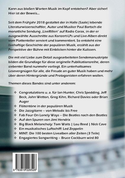 Seit dem Frühjahr 2018 gestaltet der in Halle (Saale) lebende Literaturwissenschaftler, Autor und Musiker Paul Bartsch die monatliche Sendung LiveRillen auf Radio Corax, in der er ausgewählte Ausschnitte aus Konzert-LPs und Live-Alben direkt vom Plattenteller serviert und kommentiert. So entsteht eine livehaftige Geschichte der populären Musik, erzählt aus der Perspektive der Bühne mit Einblicken hinter die Kulissen. Die mit viel Liebe zum Detail ausgearbeiteten Sendemanuskripte bilden die Grundlage für diese originelle Publikationsreihe, deren siebenter Band nunmehr vorliegt. Ein unterhaltsames Lesevergnügen für alle, die Freude an guter Musik haben und mehr über deren Hintergründe und Protagonisten erfahren wollen. Themen dieses Bandes sind unter anderem: Congratulations u. a. für Ian Hunter, Chris Spedding, Jeff Beck, John Wetton, Greg Kihn, Richard Davies oder Brian Auger Flötentöne in der populären Musik Die Jazzgitarre von Melodic bis Free Fab Four On Lonely Ways - Die Beatles nach den Beatles Auf den Spuren von Jimi Hendrix Big Black Melancholy: Tom Waits, Lou Reed, Nick Cave Ein musikalisches Luftschiff: Led Zeppelin MINT: Die 100 besten Livealben aller Zeiten (3 Teile) Engagiertes Songwriting - Bruce Cockburn wird 80