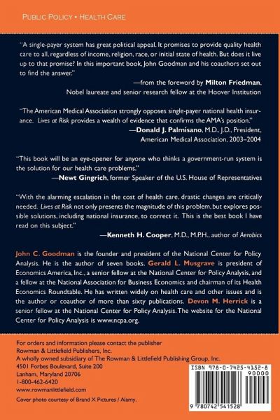 Thoroughly examines the systemic failures of national health insurance programs around the world. It identifies problems inherent in government-run health care and explains why these problems inevitably emerge. And, it demolishes one by one the prevailing myths put forward by advocates of national health insurance as the solution to issues confronting American health care. Coverings The American Medical Association strongly opposes single-payer national health insurance. Lives at Risk provides a wealth of evidence that confirms the AMA's position. -- Donald J. Palmisano, M.D., J.D., president, American Medical Association, 2003-2004 This book will be an eye-opener for anyone who thinks a government-run system is the solution for our health care problem. -- Newt Gingrich, former Speaker of the U.S. House of Representatives With the alarming escalation in the cost of health care, drastic changes are critically needed. Lives at Risk not only presents the magnitude of this problem, but explores possible solutions, including national insurance, to correct it. This is the best book I have read on this subject. -- Kenneth H. Cooper, M.D., M.P.H., author of Aerobics A single-payer system has great political appeal. It promises to provide quality health care to all, regardless of income, religion, race, or initial state of health. But does it live up to that promise? In this important book, Goodman, Musgrave, and Herrick set out to find the answer. -- from the Foreword by Milton Friedman, Nobel laureate and senior research fellow at the Hoover Institution Anybody who is tempted by the Canada [single-payer health insurance] model should read Lives at Risk. National Review Recommended. CHOICE If you're looking for intellectual ammunition to refute the perennial myths about the triumph of socialized medicine in the rest of the developed world, this book is essential. JAMA: The Journal of the American Medical Association Goodman, Musgrave and Herrick do not just make a hard-boiled assessment of single-payer systems, then run for cover. Instead of the usual worn-out generalities and obsolete assumptions, they point to specific ways to harness the intelligence of consumers and the power of the free market to improve health care in the U.S.. Regardless of whether the reader agrees with the authors' conclusions, Lives at Risk helps us to understand how different policy approaches might lead to two very different outcomes for the U.S. health care system: complete meltdown under single-payer health care or transformation into a system driven by consumer demand instead of health care bureaucrats and political expediency. Health Insurance Underwriter Goodman and company's book does an especially good job of casting doubt on the common belief that more governmental control of health care will prove more rational, productive, and fair than our current market-state mix. Reason