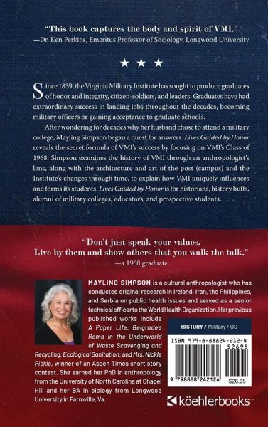 "...reveals the secret ingredients to why strong traditions at VMI have remained for almost two hundred years and the influence society has had on the school to change with the times." -Destiny Jennifer Ringgold, author of Choosing the Harder Right: West Point's 1976 Cheating Scandal "Simpson has drawn back the veil to reveal this legendary and mysterious Southern institution." -James Gallager, MSc., geologist Since 1839, the Virginia Military Institute has sought to produce graduates of honor and integrity, citizen-soldiers, and leaders. Graduates have had extraordinary success in landing jobs throughout the decades, becoming military officers or gaining acceptance to graduate schools. After wondering for decades why her husband chose to attend a military college, Mayling Simpson began a quest for answers. Lives Guided by Honor reveals the secret formula of VMI's success by focusing on VMI's Class of 1968. Simpson examines the history of VMI through an anthropologist's lens, along with the architecture and art of the post (campus) and the Institute's changes through time, to explain how VMI uniquely influences and forms its students. Lives Guided by Honor is for historians, history buffs, alumni of military colleges, educators, and prospective students.