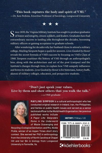 "...reveals the secret ingredients to why strong traditions at VMI have remained for almost two hundred years and the influence society has had on the school to change with the times." -Destiny Jennifer Ringgold, author of Choosing the Harder Right: West Point's 1976 Cheating Scandal "Simpson has drawn back the veil to reveal this legendary and mysterious Southern institution." -James Gallager, MSc., geologist Since 1839, the Virginia Military Institute has sought to produce graduates of honor and integrity, citizen-soldiers, and leaders. Graduates have had extraordinary success in landing jobs throughout the decades, becoming military officers or gaining acceptance to graduate schools. After wondering for decades why her husband chose to attend a military college, Mayling Simpson began a quest for answers. Lives Guided by Honor reveals the secret formula of VMI's success by focusing on VMI's Class of 1968. Simpson examines the history of VMI through an anthropologist's lens, along with the architecture and art of the post (campus) and the Institute's changes through time, to explain how VMI uniquely influences and forms its students. Lives Guided by Honor is for historians, history buffs, alumni of military colleges, educators, and prospective students.