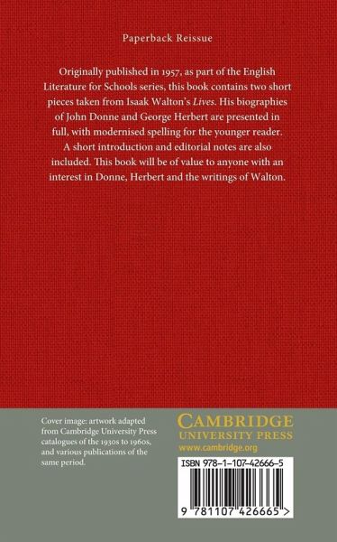 Originally published in 1957, as part of the English Literature for Schools series, this book contains two short pieces taken from Isaak Walton's Lives. His biographies of John Donne and George Herbert are presented in full, with modernised spelling for the younger reader. A short introduction and editorial notes are also included. This book will be of value to anyone with an interest in Donne, Herbert and the writings of Walton.
