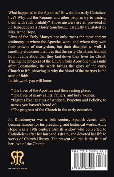 What happened to the Apostles? How did the early Christians live? Why did the Romans and other peoples try to destroy them with such brutality? Those answers are all provided in Fr. Pedro de Ribadeneyra, SJ's Flores Sanctorum, carefully translated by Mrs. Anne Hope. Lives of the Early Martyrs not only traces the most ancient testimony to where the Apostles went, and where they won their crowns of martyrdom, but their disciples as well. It carefully elucidates the lives that the early Christians led, and how it came about that they laid down their lives for Christ. Tracing the progress of the Church from Apostolic times until after Constantine, the work brings the glory of the early Church to life, showing us why the blood of the martyrs is the seed of faith. In this work you will learn: The lives of the Apostles and their resting place; The lives of many saints, fathers, and holy women; Figures like Ignatius of Antioch, Perpetua and Felicity, to names you haven't heard of; The progress of the Church in the early centuries. Fr. Pedro de Ribadeneyra, SJ, was a 16th century Jesuit who was a great preacher, as well as spiritual writer and historian. Anne Hope was a British widow who converted to Catholicism after her husband's death, and devoted her life to works of Church History. The present volume is the fruit of her love of the Church.