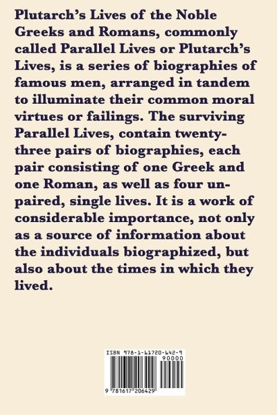 Plutarch's Lives of the Noble Greeks and Romans, commonly called Parallel Lives or Plutarch's Lives, is a series of biographies of famous men, arranged in tandem to illuminate their common moral virtues or failings. The surviving Parallel Lives, contain twenty-three pairs of biographies, each pair consisting of one Greek and one Roman, as well as four unpaired, single lives. It is a work of considerable importance, not only as a source of information about the individuals biographized, but also about the times in which they lived.