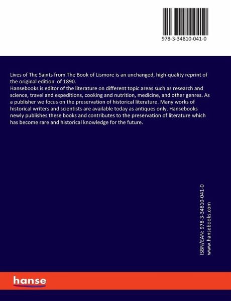 Lives of The Saints from The Book of Lismore is an unchanged, high-quality reprint of the original edition of 1890.Hansebooks is editor of the literature on different topic areas such as research and science, travel and expeditions, cooking and nutrition, medicine, and other genres. As a publisher we focus on the preservation of historical literature. Many works of historical writers and scientists are available today as antiques only. Hansebooks newly publishes these books and contributes to the preservation of literature which has become rare and historical knowledge for the future.