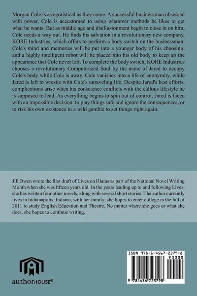 Morgan Cole is as egotistical as they come. A successful businessman obsessed with power, Cole is accustomed to using whatever methods he likes to get what he wants. But as middle age and disillusionment begin to close in on him, Cole needs a way out. He finds his salvation in a revolutionary new company, KORE Industries, which offers to perform a body switch on the businessman. Cole's mind and memories will be put into a younger body of his choosing, and a highly intelligent robot will be placed into his old body to keep up the appearance that Cole never left. To complete the body switch, KORE Industries chooses a revolutionary Computerized Soul by the name of Jared to occupy Cole's body while Cole is away. Cole vanishes into a life of anonymity, while Jared is left to wrestle with Cole's unraveling life. Despite Jared's best efforts, complications arise when his conscience conflicts with the callous lifestyle he is supposed to lead. As everything begins to spin out of control, Jared is faced with an impossible decision: to play things safe and ignore the consequences, or to risk his own existence in a wild gamble to set things right again.