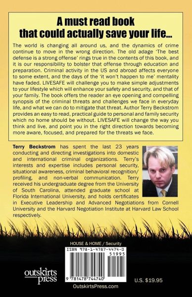 A must read book that could actually save your life. The world is changing all around us, and the dynamics of crime continue to move in the wrong direction. The old adage 'The best defense is a strong offense' rings true in the contents of this book, and it is our responsibility to bolster that offense through education and preparation. Criminal activity in the US and abroad affects everyone to some extent, and the days of the 'it won't happen to me' mentality have faded. LIVESAFE will challenge you to make simple adjustments to your lifestyle which will enhance your safety and security, and that of your family. The book offers the reader an eye opening and compelling synopsis of the criminal threats and challenges we face in everyday life, and what we can do to mitigate that threat. Author Terry Beckstrom provides an easy to read, practical guide to personal and family security which no home should be without. LIVESAFE will change the way you think and live, and point you in the right direction towards becoming more aware, focused, and prepared for the threats we face.