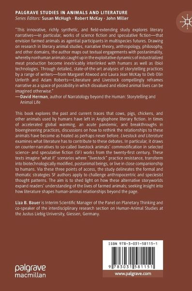 This book explores the past and current traces that cows, pigs, chickens, and other animals used by humans have left in Anglophone literary fiction. In times of accelerated global warming, an acute pandemic, and breakthroughs in bioengineering practices, discussions on how to rethink the relationships to these animals have become as heated as perhaps never before. Livestock and Literature examines what literature has to contribute to these debates. In particular, it draws on counter-narratives to so-called livestock animals' commodification in selected science- and speculative fiction (SF) works from the twenty-first century. These texts imagine 'what if' scenarios where "livestock" practice resistance, transform into biotechnologically modified, postanimal beings, or live in close companionship to humans. Via these three points of access, the study delineates the formal and thematic strategies SF authors apply to challenge anthropocentric and speciesist thought patterns. Theaim is to shed light on how these alternative storyworlds expand readers' understanding of the lives of farmed animals; seeking insight into how literature shapes human-animal relationships beyond the page.