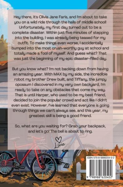 Hey there, it's Olivia Jane Faris, and I'm about to take you on a wild ride through the halls of middle school! Unfortunately, my first day turned out to be a complete disaster. Within just five minutes of stepping into the building, I was already being teased for my outfit. To make things even worse, I accidentally bumped into the most crush-worthy guy at school and totally made a fool of myself. And guess what? That was just the beginning of my epic disaster-filled day. But you know what? I'm not backing down from having an amazing year. With MAX by my side, the incredible robot my brother Drew built, and Tiffany, the jumpy opossum I discovered in my very own backyard, I'm ready to take on any obstacles that come my way. That is until Harper, who used to be my best friend, decided to join the popular crowd and act like I didn't even exist. However, I've learned that everyone is going through things we can't always see, and this year, my greatest skill is being a good friend. So, what are you waiting for? Grab your backpack, and let's go! The bell is about to ring. <3 Livie