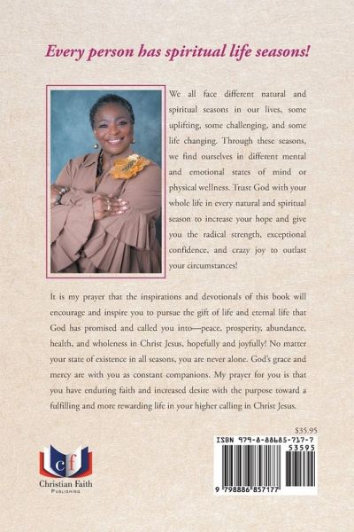 Every person has spiritual life seasons! We all face different natural and spiritual seasons in our lives, some uplifting, some challenging, and some life changing. Through these seasons, we find ourselves in different mental and emotional states of mind or physical wellness. Trust God with your whole life in every natural and spiritual season to increase your hope and give you the radical strength, exceptional confidence, and crazy joy to outlast your circumstances! It is my prayer that the inspirations and devotionals of this book will encourage and inspire you to pursue the gift of life and eternal life that God has promised and called you into--peace, prosperity, abundance, health, and wholeness in Christ Jesus, hopefully and joyfully! No matter your state of existence in all seasons, you are never alone. God's grace and mercy are with you as constant companions. My prayer for you is that you have enduring faith and increased desire with the purpose toward a fulfilling and more rewarding life in your higher calling in Christ Jesus.