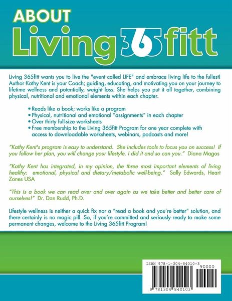Lifestyle Wellness are two words that, when combined, are powerful and compelling, implying a healthy balance of the many aspects of your life. It carries with it an underlying tone of longevity or foreverness, a journey on a never-ending continuum to a healthy lifestyle. Think of it as a journey on a road, where the road has no specific destination, but it does have a direction. The road may present roadblocks, potholes and detours. It may have turns and hills and even rest stops. But, as long as you stay on the road, you're making progress on your journey. Lifestyle wellness is like that road. This book is intended to be a journey over the course of approximately twelve weeks. Within each chapter are three separate sections focusing on and providing physical, nutritional, and emotional support - the three major components of successful weight loss, a healthy body, and lifestyle change. Get your complimentary 12-week membership at http://www.365fitt.com/individual.