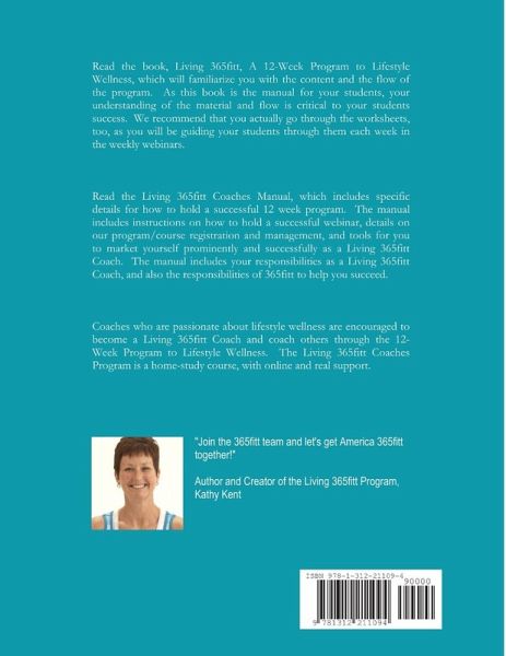 The Living 365fitt Coaches Program and Coaching Manual is for health and fitness professionals and enthusiasts who are passionate about lifestyle wellness. Through a combination of the book, The Living 365fitt, 12-Week Program to Lifestyle Wellness, and the Coaches Manual, individuals are able to inspire others towards better lifestyle habits. The program is an interactive, coached program for individuals who want to increase their wellness through permanent lifestyle change. The program focuses on living a healthier and more active life by changing one's physical, nutritional and emotional habits. The program uses a combination of tools (book, worksheets, webinars, interactive coaching, consultations, and an exclusive membership program) to coach others to success. The program is appropriate for: ¿ Clubs ¿ Communities ¿ Schools ¿ Corporate wellness programming