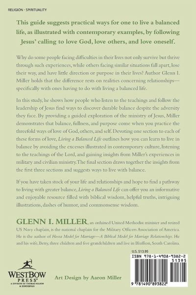 Why do some people facing difficulties in their lives not only survive but thrive through such experiences, while others facing similar situations fall apart, lose their way, and have little direction or purpose in their lives? Author Glenn I. Miller holds that the difference rests on realities concerning relationships-specifically with ones having to do with living a balanced life. In this study, he shows how people who listen to the teachings and follow the leadership of Jesus find ways to discover durable balance despite the adversity they face. By providing a guided exploration of the ministry of Jesus, Miller demonstrates that balance, fullness, and purpose come when you practice the threefold ways of love of God, others, and self. Devoting one section to each of these forms of love, Living a Balanced Life outlines how you can learn to live in balance by avoiding the excesses illustrated in contemporary culture, listening to the teachings of the Lord, and gaining insights from Miller's experiences in military and civilian ministry. The final section draws together the insights from the first three sections and suggests ways to live with balance. If you have taken stock of your life and relationships and hope to find a pathway to living with greater balance, Living a Balanced Life can offer you an informative and enjoyable resource filled with biblical wisdom, helpful truths, intriguing illustrations, dashes of humor, and commonsense wisdom.