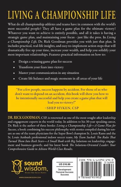 What do all championship athletes and teams have in common with the world's most successful people? They all have a game plan for the ultimate victory! Whatever you want to achieve is entirely possible, and all it takes is having a strategic game plan, and maintaining your focus - just like the pros. In Living a Championship Life, Dr. Rick Goodman provides you with just that plan. It includes practical, real-life insights, and easy-to-implement action steps that will dramatically free up your time, increase your wealth, and help you solidify your most important relationships. Features practical information on how to: * Design a winning game plan for success * Transform your fears into victory * Master your communication in any situation * Create life balance and magic moments in all areas of your life "For a few people, success happens by accident. For those of us who don't want to depend on accident, this book will show you how to be intentionally successful and help you create a game plan that will lead you to victory!" -Shep Hyken, CSP