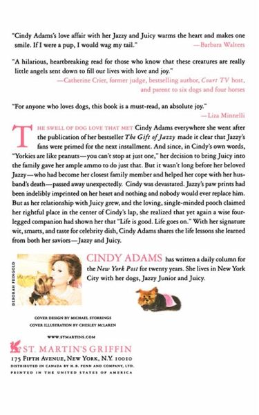 The swell of dog love that met Cindy Adams everywhere she went after the publication of her bestseller The Gift of Jazzy made it clear that Jazzy's fans were primed for the next installment. And since, in Cindy's own words, "Yorkies are like peanuts-you can't stop at just one," her decision to bring Juicy into the family gave her ample ammo to do just that. But it wasn't long before her beloved Jazzy-who had become her closest family member and helped her cope with her husband's death-passed away unexpectedly. Cindy was devastated. Jazzy's paw prints had been indelibly imprinted on her heart and nothing and nobody would ever replace him. But as her relationship with Juicy grew, and the loving, single-minded pooch claimed her rightful place in the center of Cindy's lap, she realized that yet again a wise four-legged companion had shown her that "Life is good. Life goes on." With her signature wit, smarts, and taste for celebrity dish, Cindy Adams shares the life lessons she learned from both her saviors-Jazzy and Juicy.