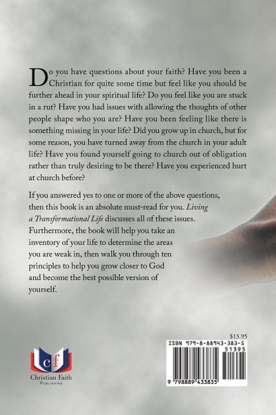Do you have questions about your faith? Have you been a Christian for quite some time but feel like you should be further ahead in your spiritual life? Do you feel like you are stuck in a rut? Have you had issues with allowing the thoughts of other people shape who you are? Have you been feeling like there is something missing in your life? Did you grow up in church, but for some reason, you have turned away from the church in your adult life? Have you found yourself going to church out of obligation rather than truly desiring to be there? Have you experienced hurt at church before? If you answered yes to one or more of the above questions, then this book is an absolute must-read for you. Living a Transformational Life discusses all of these issues. Furthermore, the book will help you take an inventory of your life to determine the areas you are weak in, then walk you through ten principles to help you grow closer to God and become the best possible version of yourself.