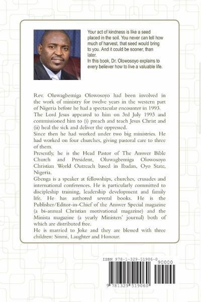 Your act of kindness is like a seed placed in the soil. You never can tell how much of harvest, that seed would bring to you. And it could be sooner, than later. In this book, Dr. Olowosoyo explains to every believer how to live a valuable life.