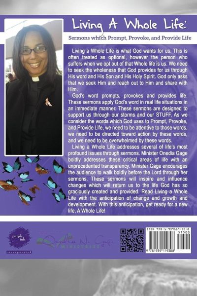 Living a Whole Life is what God wants for us. This is often treated as optional, however the person who suffers when we opt out of that Whole life is us. We need to seek the wholeness that God provides for us through His word and His Son and His Holy Spirit. God only asks that we seek Him and reach out to Him and share with Him. God’s word prompts, provokes and provides life. These sermons apply God’s word in real life situations in an immediate manner. These sermons are designed to support us through our storms and our STUFF. As we consider the words which God uses to Prompt, Provoke, and Provide Life, we need to be attentive to those words, we need to be directed toward action by these words, and we need to be overwhelmed by these words. Living a Whole Life addresses several of life’s most profound issues through sermons. Minister Onedia Gage boldly addresses these critical areas of life with an unprecedented transparency. Minister Gage encourages the audience to walk boldly before the Lord through her sermons. These sermons will inspire and influence changes which will return us to the life God has so graciously created and provided. Read Living a Whole Life with the anticipation of change and growth and development. With this anticipation, get ready for a new life, A Whole Life!