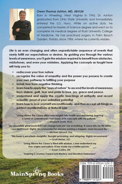 Life is an ever changing and often unpredictable sequence of events that rarely fulfill our expectations or desires. By guiding you through the various levels of awareness, you'll gain the wisdom required to benefit from obstacles, misfortunes, and even your mistakes. Applying the concepts as taught here will help you to:rediscover your true nature recognize the value of empathy and the power you possess to create your own pathway to fulfilling your purpose break free from negative thinking learn how to apply the "laws of nature" to ascend the levels of awareness from shame, guilt, fear and pride to love, joy, grace and peace. understand and apply the cryptic teachings of antiquity and recent scientific proof of your unlimited potential learn how to love yourself unconditionally, and thus accept all things as perfect manifestations of Natural Law "Living Above the Chaos offers new insights into health and well-being, inspiring a sense of contentment. I use many of its concepts with my patients."- Elizabeth Smith, Ph.D."An absolutely great book that can change how you see everything. It came into my life when I needed it most. Highly recommended for anyone seeking a happier, more focused life."- Michael Minardi, Esq."This book is excellent-insightful, thought-provoking, and intriguing. Highly recommend."- Scott Meisel, DO"Living Above the Chaos is filled with wisdom. I now understand my true origins and nature. It has made me a better person."- Susan Collins, RN"Inspiring a Journey Toward Self-Mastery and Elevated Awareness"