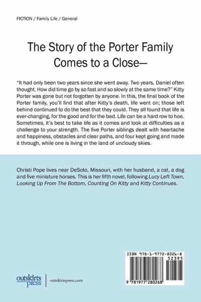 "It had only been two years since she went away. Two years, Daniel often thought. How did time go by so fast and so slowly at the same time?" Kitty Porter was gone but not forgotten by anyone. In this, the final book of the Porter family, you'll find that after Kitty's death, life went on; those left behind continued to do the best that they could. They all found that life is ever-changing, for the good and for the bad. Life can be a hard row to hoe. Sometimes, it's best to take life as it comes and look at difficulties as a challenge to your strength. The five Porter siblings dealt with heartache and happiness, obstacles and clear paths, and four kept going and made it through, while one is living in the land of uncloudy skies.