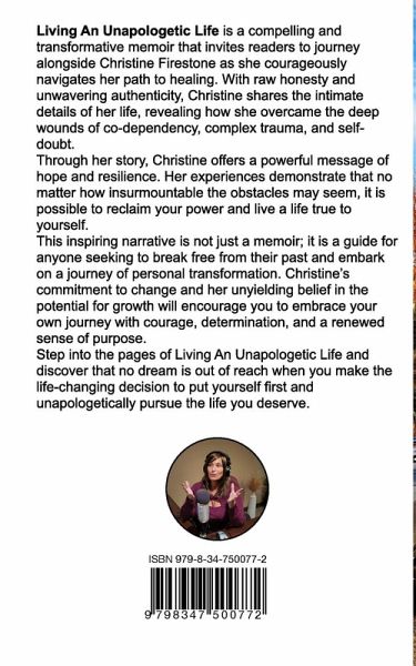 Living An Unapologetic Life is a compelling transformative memoir of the journey of Christine Firestone and her courageous path of healing. Christine shares with raw honesty and unwavering authenticity intimate details of her life overcoming the deep wounds of codependency, complex trauma and self-doubt. Her story is a powerful message of hope and resilience, and serves as a demonstration that no matter how insurmountable the obstacles seem, it is possible to reclaim your power and live a life true to yourself. This is an inspiring memoir for anyone seeking to break free from their past to embark on a transformational journey of healing. Christine's commitment to change and belief in the potential for growth will inspire your personal courage. Living an Unapologetic Life is a resource of encouragement to discover that no dream is out of reach when you make the life changing decision to put yourself first and unapologetically pursue the life you deserve.