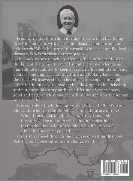 From war child to wisdom during 90 years of active living, Eric Kitchen deals with death and disaster, and a whole lot in between. Much history of the world, which the family lived through, is woven through these pages. The book Future Shock, by Alvin Toffler, influenced Eric's thinking at the time. It warned about the rate of change and humankind's inability to keep pace. Eric likened life to being on a fast-moving, accelerating train and looking back along the track, with several branches ahead unseen or untested. Written in an easy-to-read style, able to be picked up and put down, his story outlines a lifetime of experiences, good and bad, which shows the will to live and how the human spirit prevails. Eric considers the following words ascribed to Sir Winston Churchill, who won the Nobel Prize for Literature in 1953: When I look back on all these worries, I remember the story of the old man who said on his deathbed that he had had a lot of trouble in his life, most of which had never happened. Eric also realised through the process of writing this book that the only constant in life is change itself.