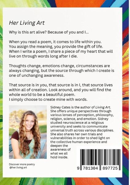 Read Living Art from front to back or from back to front. This poetry collection tells an all encompassing story of life from the beginnings (or destination) of pure perception, through the portals of science and spirituality, to the complex emotions of love and loss that bring us face to face with who we are. Naturally, I recommend that you first read Living Art front to back, for you will find the simplicity of perception to blend beautifully into abstract thought and finally end with the darkness that must eventually be discovered if one is to make their way back through the pages and fully appreciate the beauty of all things ordinary. Enjoy the journey!