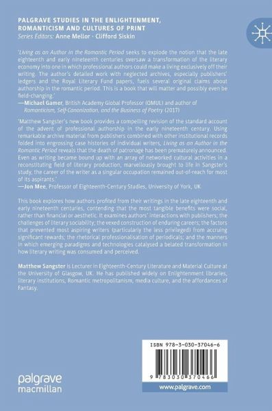 This book explores how authors profited from their writings in the late eighteenth and early nineteenth centuries, contending that the most tangible benefits were social, rather than financial or aesthetic. It examines authors' interactions with publishers; the challenges of literary sociability; the vexed construction of enduring careers; the factors that prevented most aspiring writers (particularly the less privileged) from accruing significant rewards; the rhetorical professionalisation of periodicals; and the manners in which emerging paradigms and technologies catalysed a belated transformation in how literary writing was consumed and perceived.